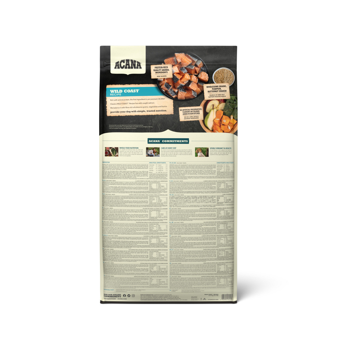 Rauwe zalm (22 %), gedroogde haring (19 %), parelgort, hele erwten, havergrutten, varkensvet (8 %), hele haver, kikkererwtenvezel, visolie (1 %), calciumcarbonaat, kaliumchloride, gedroogde kelp, zout, gedroogde cichoreiwortel, verse hele pompoen, verse hele flespompoen, verse hele wortels, verse hele appels, verse hele peren, verse hele courgette, verse boerenkool, verse spinazie, verse raapstelen, vers bietenloof, hele veenbessen, hele bosbessen, hele Saskatoon-bessen, kurkuma, mariadistel, kliswortel, lavendel, heemstwortel, rozenbottels. |