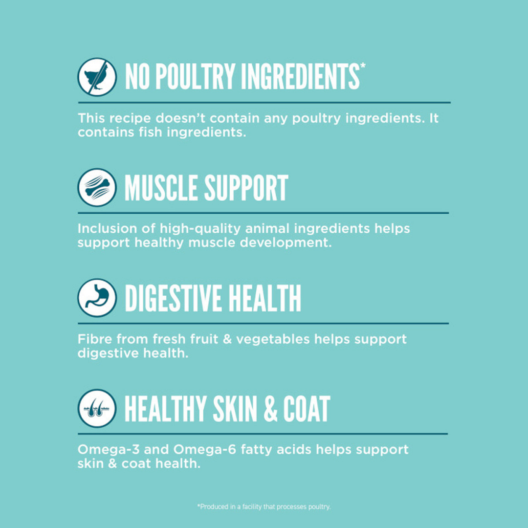 Rauwe zalm 14%, rauwe haring 14%, rauwe hele heek 6%, rauwe hele koolvis 6%, rauwe Atlantische zalm 6%, hele rode linzen, hele groene erwten, hele kekererwten, hele tuinbonen, hele haring, linzenvezel, kippenlever 3%, eendenvet 2%, haringolie 2%, hele appel, hele courgette, hele broccoli, verse peterselie, verse spinazie, hele cranberry, kurkuma, rode bietenvezels, zout. |