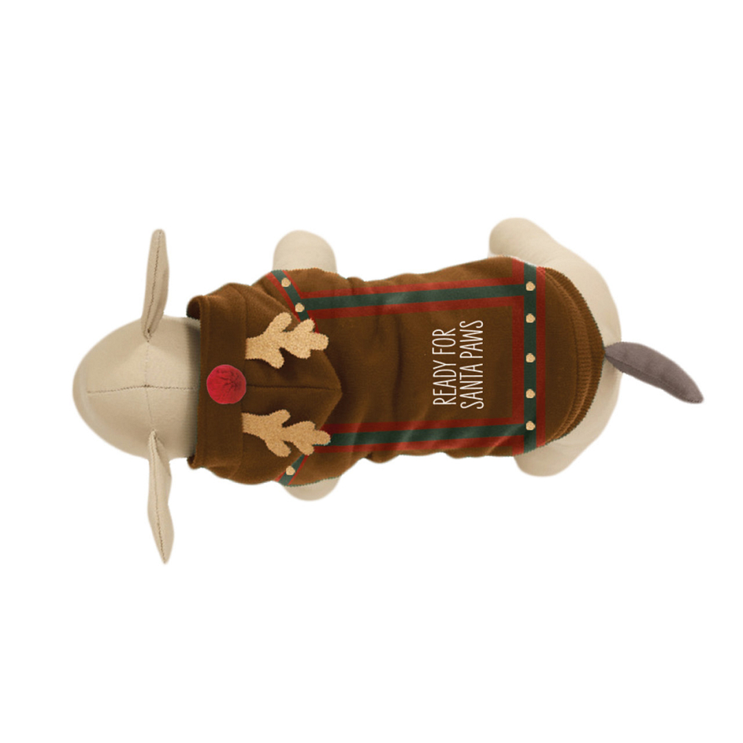 Deze hondensweater met leuk opschrift Ready for Santa Paws is niet alleen erg stijlvol en feestelijk, maar ook super comfortabel en gezellig. Deze kersttrui voor honden is namelijk gemaakt van een aangename en zachte sweaterstof van 100% polyester en is aan de binnenkant uitgerust met een extra zachte en wollige stof, om je huisdier ook op de koudste dagen van het jaar lekker warm te houden. De sweater heeft niet alleen een grappig opschrift, maar ook een bijpassende tekening van het gareel van een rendier. Daarnaast zit er op de kap een schattig gewei en een rode pompon als neus van Rudolf het rendier. Bovendien is de sweater voorzien van een ritssluiting, waardoor je hem makkelijk aan en uit kan doen en is de trui wasbaar in de wasmachine op 30 graden.