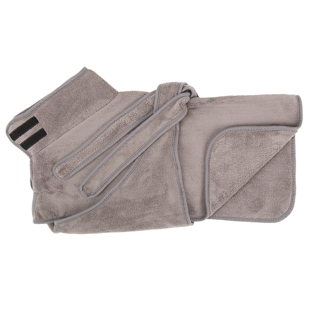 De badjas heeft verstelbare hals- en lichaamsbevestigingen, waardoor deze past bij honden van alle rassen en maten, en een comfortabele pasvorm heeft.