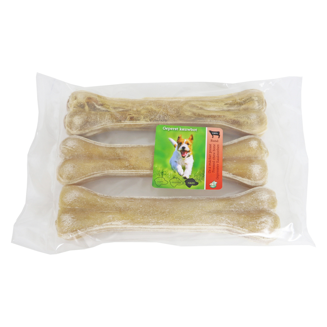Uw hond moet goed kauwen op geperste botten, waarmee het direct een verzorgende werking heeft op het gebit van uw hond.