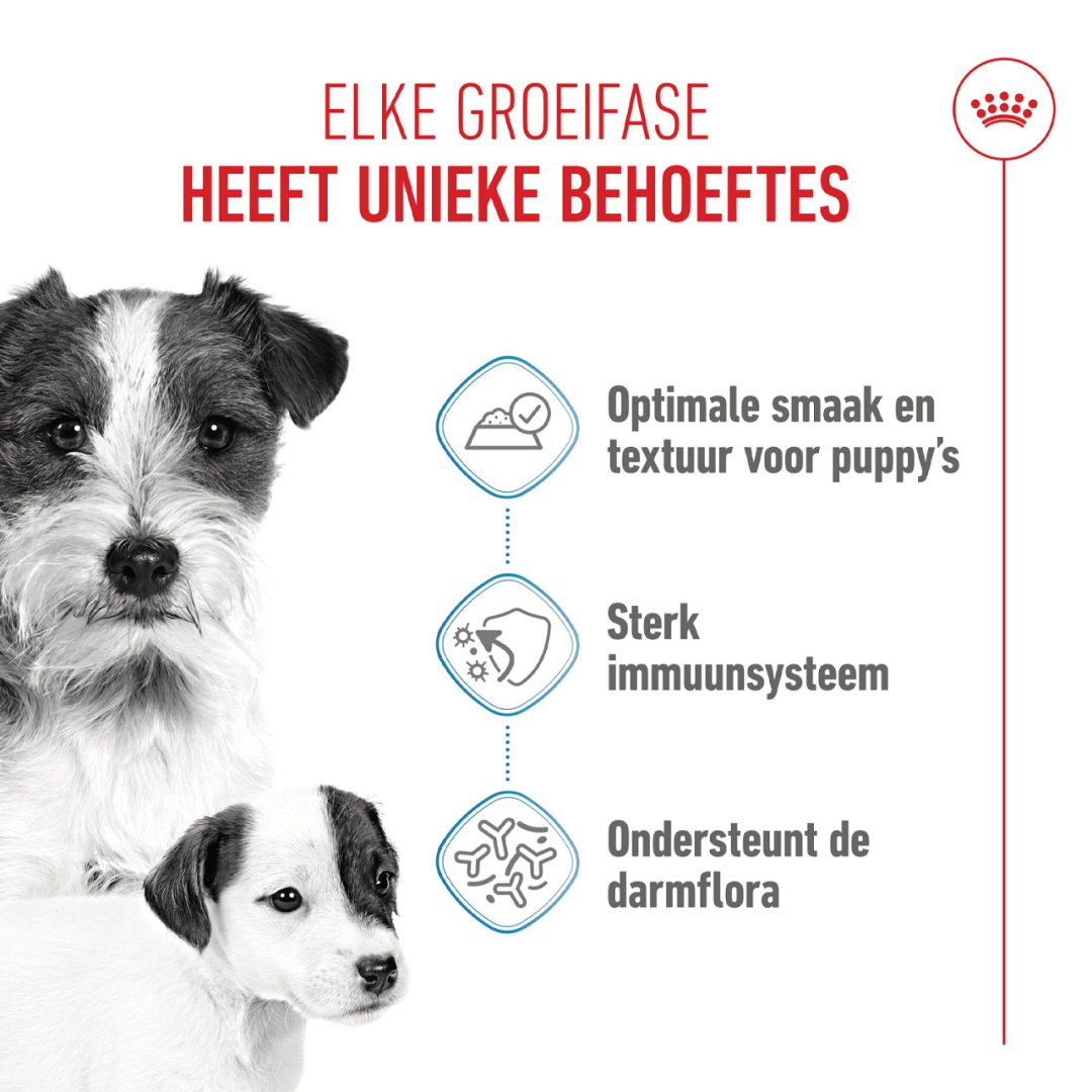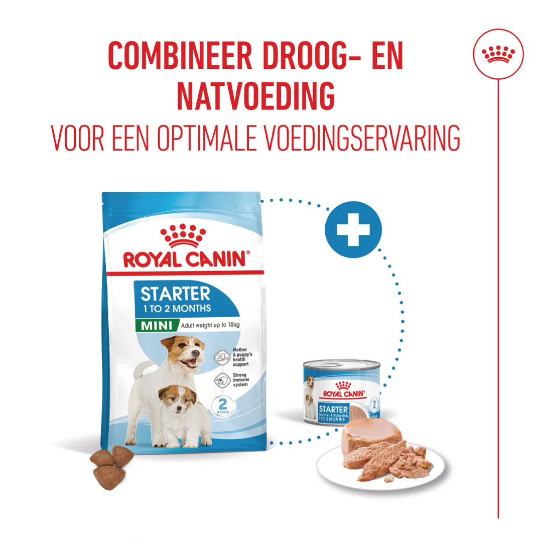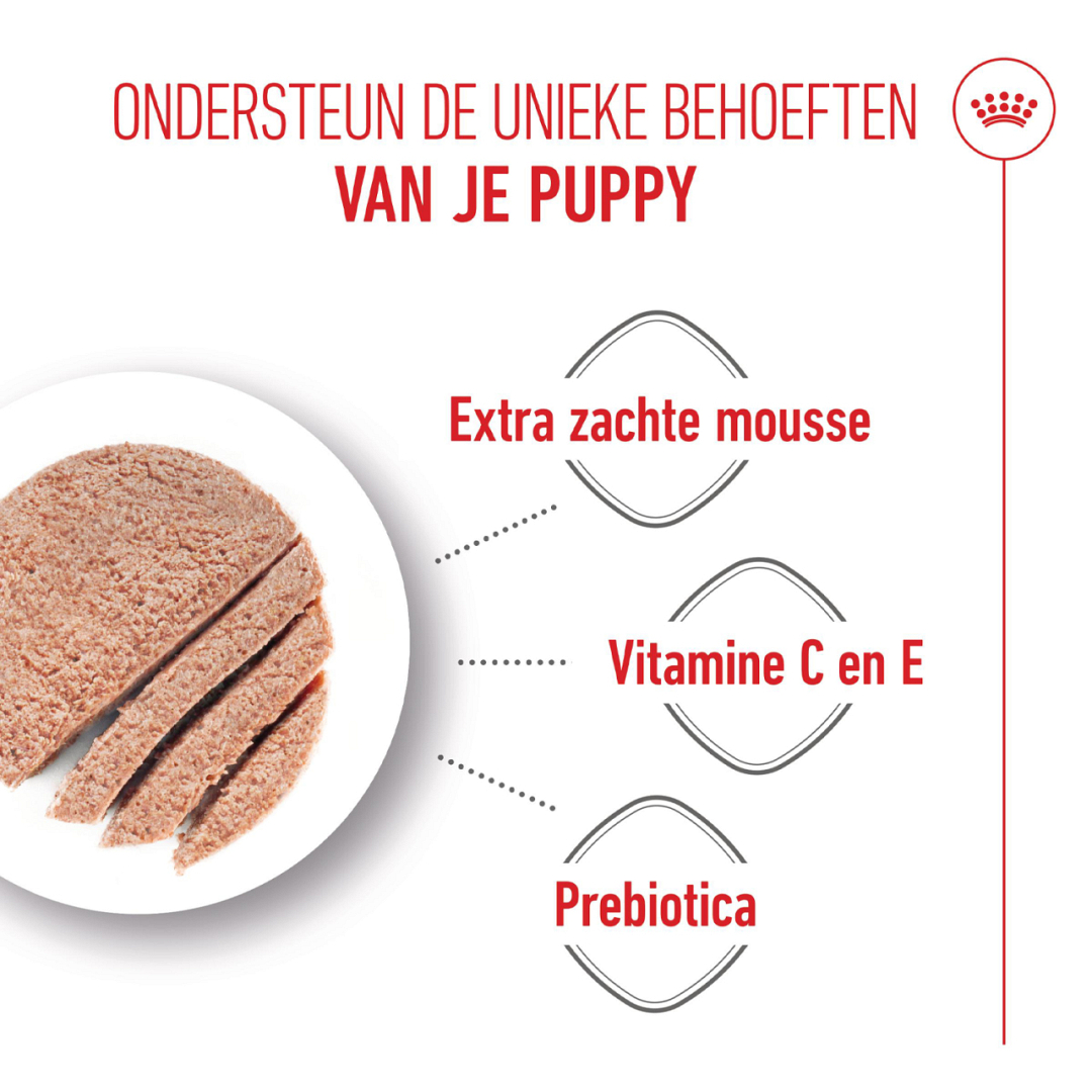 De exclusieve combinatie van voedingsstoffen, die ook in de moedermelk aanwezig is, is verrijkt met specifieke voedingsstoffen. Dit vergemakkelijkt de overgang van moedermelk naar vaste voeding en levert een actieve bijdrage aan een gezonde spijsvertering en de natuurlijke weerstand van puppy’s. De toegevoegde vitamine D in Royal Canin Starter Mousse Mother & Babydog helpt mee de balans van calcium en fosfor in het lichaam van je hond optimaal te houden. Het ondersteunt ook de ontwikkeling van sterke spieren en gezonde botten en gewrichten.