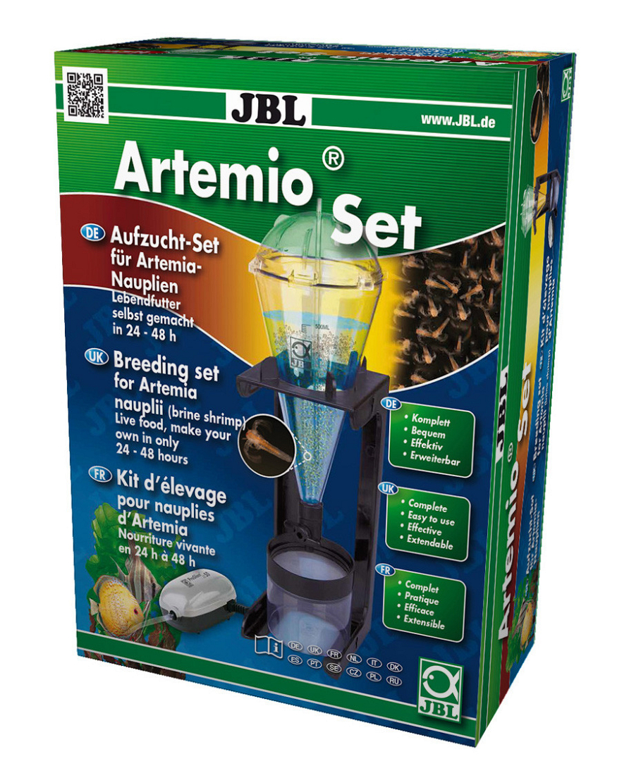 Inhoud: 1 kweekset voor levend voer, ArtemioSet, incl. 1 trechtervormig broedreservoir met koepeldeksel, 1 standaard met schroeven, 1 ventilatiepomp, 1 opvangreservoir, 1 artemiazeef, 1 luchtslang van 8 mtr en 1 terugslagventiel.