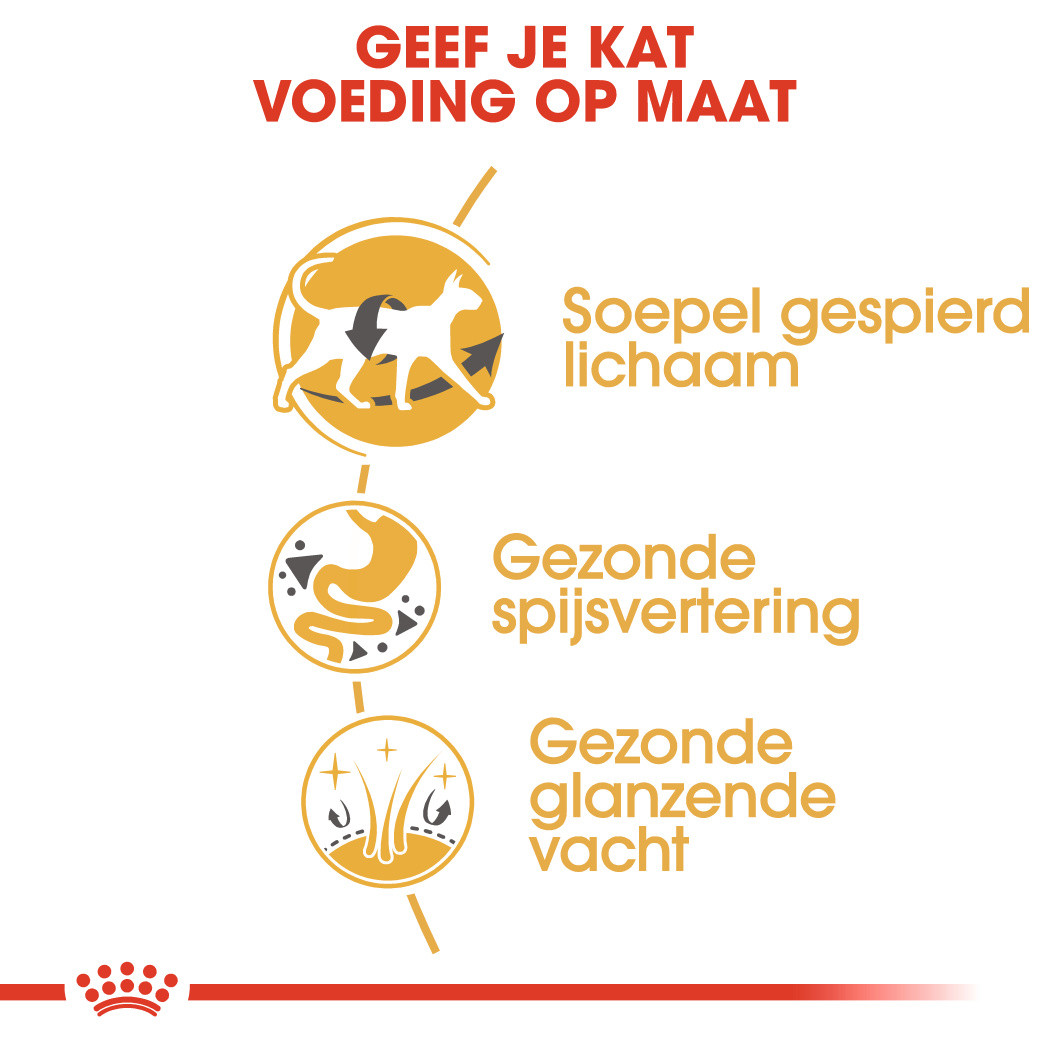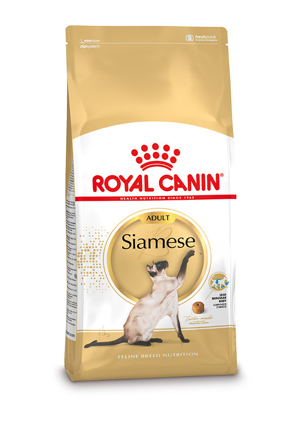 De Siamese kat heeft een lang, slank, atletisch en sierlijk uiterlijk. Ze heeft een korte vacht waardoor haar gespierde lichaam goed te zien is. De Siamees is een van de oudste rassen ter wereld. Ontstaan in de 4e eeuw aan het Koninklijk hof van Siam. Het huidige Thailand. Royal Canin Siamese Adult bevat precies de juiste combinatie voedingsstoffen om de huid glanzend te houden en haar gezonde gewicht te helpen behouden.