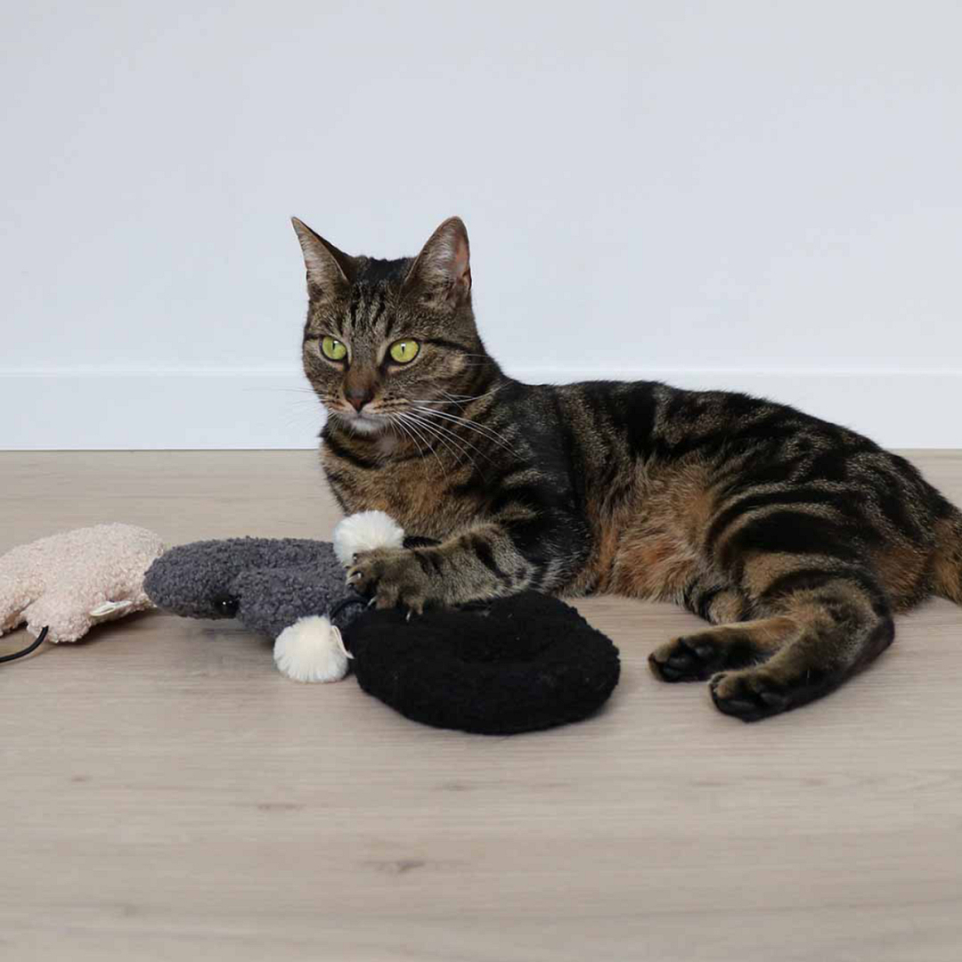 Speelkussen voor jouw kat, met belletje, pluizige balletjes en knisperfolie.