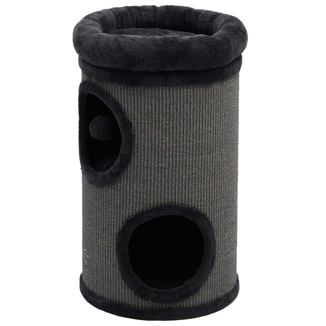 Krabton met 2 gaten en 3 comfortabele slaapplaatsen. Aan de buitenkant bekleed met sisal om de nagels aan te scherpen. Afm. Ø 38 x 66 cm.