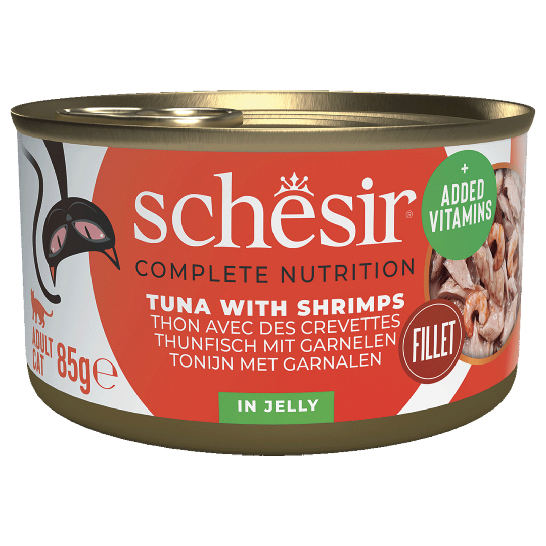 Schesir kattenvoer Complete nutrition tonijn en garnalen in gelei is gebaseerd op echte filets van heerlijke tonijn gecombineerd met garnalen. Deze voeding in gelei zal zeker favoriet zijn bij katten die dol zijn op de smaken van de zee.
