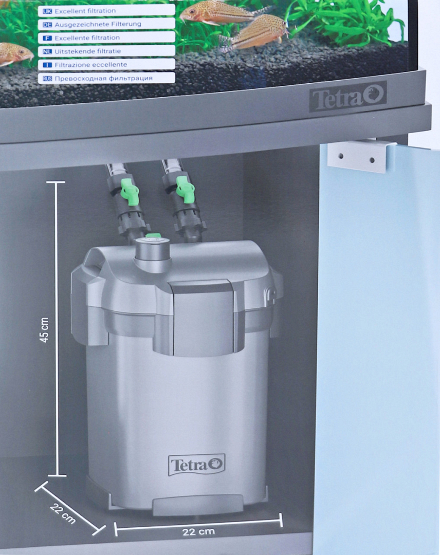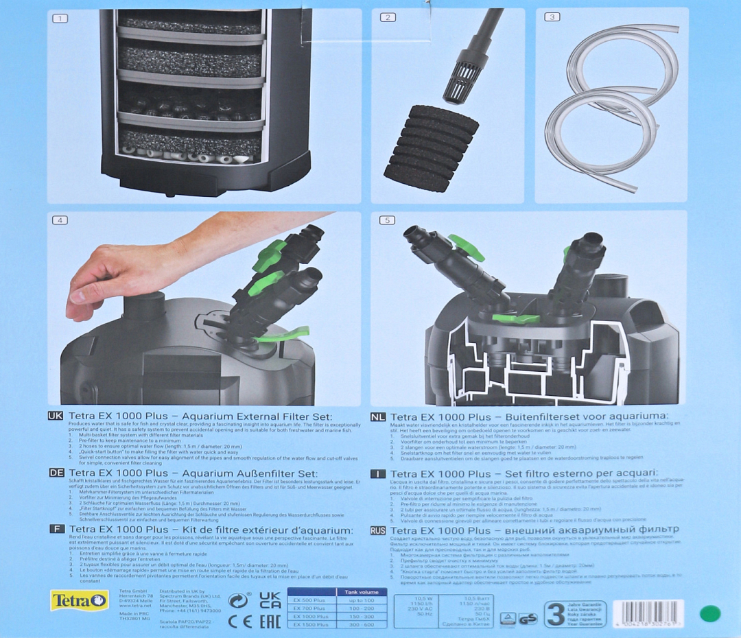 Om uw vissen en planten gezond te houden is een permanente filtering van het aquariumwater nodig. De Tetra EX 1000 Plus complete buitenfilterset zorgt voor een uitstekende waterkwaliteit voor vissen in aquaria met een inhoud van 100 tot 300 liter. In deze complete set zijn alle filtermaterialen inbegrepen om het filter snel en eenvoudig te activeren en onmiddellijk in gebruik te nemen. Het uit meerdere korven opgebouwde systeem en verschillende filtermaterialen reinigen niet alleen het aquariumwater op betrouwbare en efficiënte wijze door overtollige voedingsstoffen af te breken, maar bieden ook een fascinerende inkijk in het aquariumleven door het aquariumwater kristalhelder te maken. Bovendien is de Tetra EX 1000 Plus complete buitenfilterset bijzonder krachtig met een 26% hoger debiet, maar toch energiezuinig en stil. Extra functies zoals een aanzuighulp om het filter te starten, ventielen om de waterstroom nauwkeurig te regelen en een voorfilterfunctie om het onderhoud tot een minimum te beperken, maken de Tetra EX 1000 Plus complete buitenfilterset ideaal voor alle aquariumhouders.